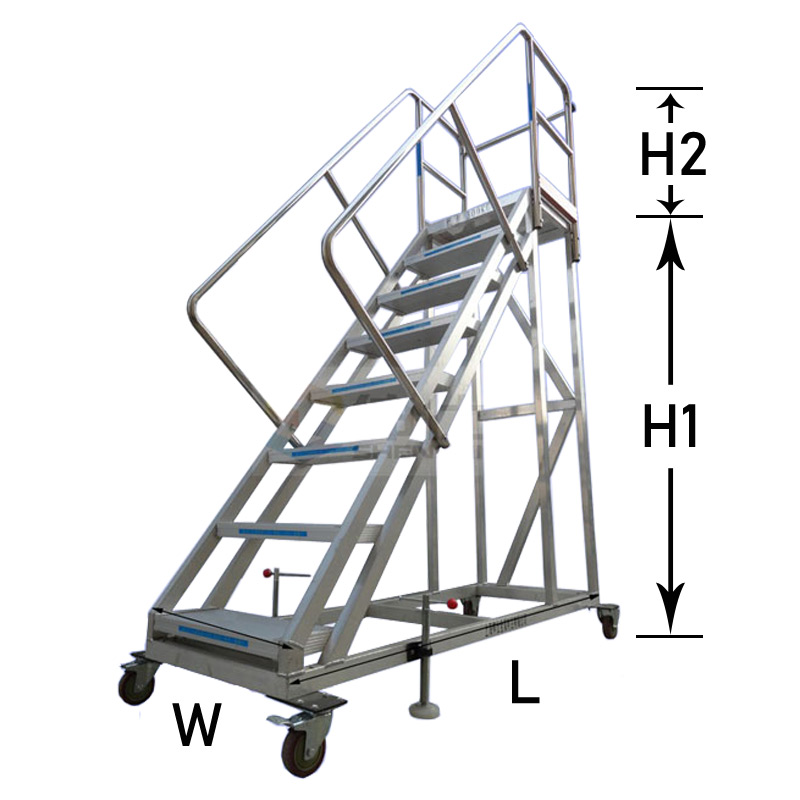 L指前輪到后輪總長(zhǎng)度,W1指登高梯主體寬度,W2指腳輪外裝最大寬度,H1指平臺(tái)高度,H2指護(hù)欄高度