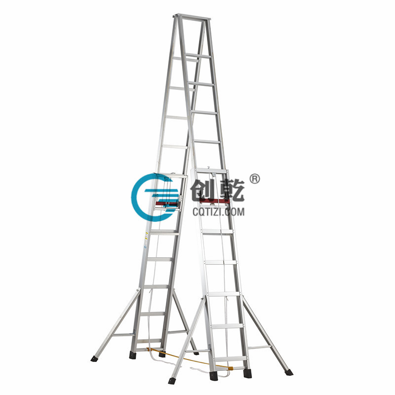 CQS-10M伸縮梯子8只腳知珠腳設計,保證梯子伸長最高時不會向任何方向傾斜,特別提示:當階梯高低不一時,人B須從低處往上上梯子,并且高處最好能有個人協(xié)助扶住梯子。其它場合使用,打開梯子后不需要任何人幫忙,一個人可放心作業(yè)。